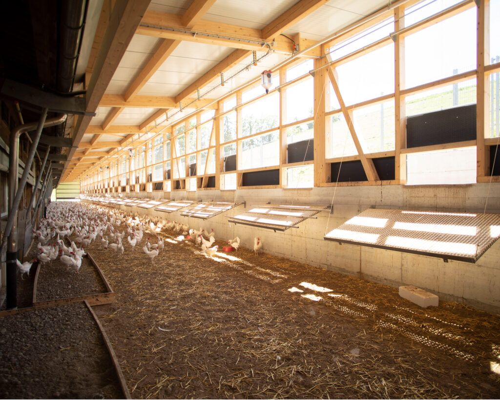 Unsere Legehennen geniessen den grosszügigen Stall mit hellem Wintergarten, befestigten Allwetterplatz und der grossen Weidefläche. Wir produzieren die Eier für die Firma Lüchinger & Schmid, einer Tochtergesellschaft der MIGROS. Wir werden durch den STS, den MIGROS-Genossenschaftsbund, sowie der KOL Thurgau kontrolliert.